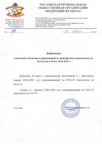Обращаем Ваше внимание, на перенос турнир среди команд 2008/09 г.р. в г.Морозовске с 9 на 24 февраля, и турнира среди команд 2004/05 г.р. в г. Донецк с 23 февраля на 9 марта.