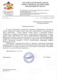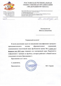 В целях реализации задач по повышению квалификации тренерского-преподавательского состава образовательных учреждений,занимающихся подготовкой юных футболистов прошу Вас в срок до 6 февраля 2019 года отправить на эл.адрес ffug@mail.ru информация о тренерах по футболу, которые работают в вашей школе (Академии) согласно приложению.