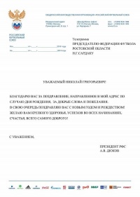 В адрес областной федерации футбола поступило поздравление от Президента РФС Александра Валерьевича Дюкова.