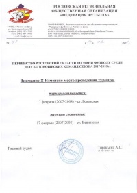 Обращаем ваше внимание, на перенос однодневного турнира среди команд 2007/08 г.р. из ст. Боковской в ст. Вешенскую.