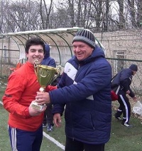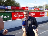 Ветеран донского футбола получил памятный знак из рук мэра города Новошахтинска Игоря Николаевича Сорокина перед первым финальным матчем Кубка газеты «Молот».